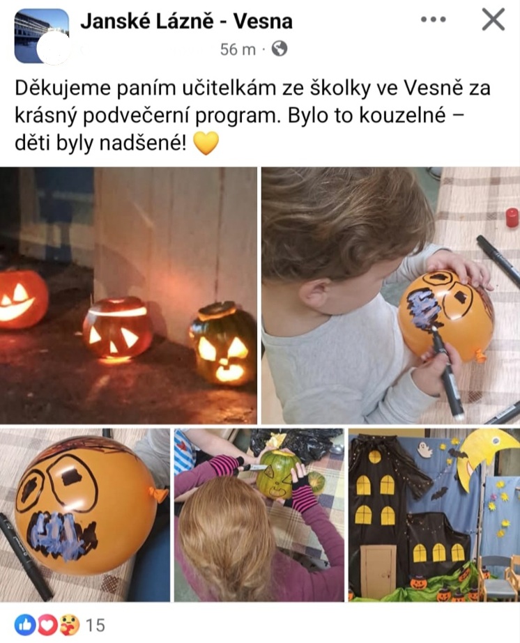 Dne 31. října 2025 se na oddělení 5. B konalo podzimní Dýňobraní. Děti společně se svými rodiči plnili veselé „dýňové úkoly”, sbírali dýně, vydlabávali je a tvořili dýňové lucerničky i veselé dýně z balónků. Do všech činností se pustili s velkým zaujetím a radostí. Po příjemně stráveném odpoledni nechyběla ani sladká tečka – ochutnávka halloweenských dýní, které s láskou napekly paní učitelky. Dýňobraní se neslo v duchu pohody a vzájemné spolupráce. Děti si s úsměvem odnášely své dýňové výrobky na pokoje, kde jim budou připomínat společně prožité chvíle.