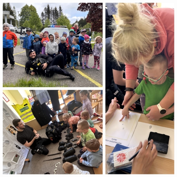 Dne 15. května 2025 se v mateřské škole uskutečnila beseda s příslušníkem Policie ČR z policejní stanice Svoboda n.Úpou, která byla pro děti i jejich rodiče velkým zážitkem. Policista dětem představil svou výstroj a výzbroj, kterou si mohly vyzkoušet – včetně policejních pout. Děti si také vytvářely otisky prstů na památku a zkoušely dýchat do alkohol testeru. Společně s policistou besedovaly o tom, jak se zachovat v různých nebezpečných situacích. Na závěr si prohlédly policejní vůz a měly možnost klást otázky o práci policie. Beseda byla velmi interaktivní a přínosná, přispěla k rozvoji povědomí o bezpečnosti u dětí i jejich rodičů.